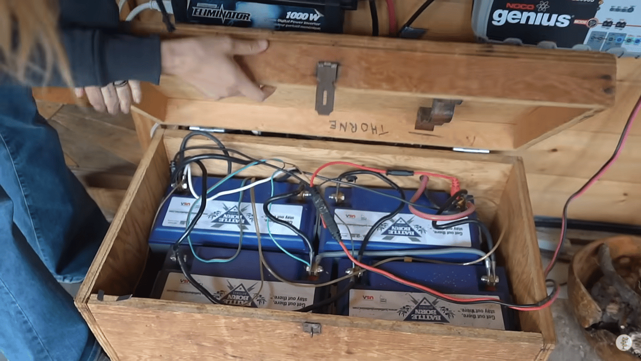 O sistema de energia foi se expandindo com o tempo, de uma pequena placa a família foi para 5 de boa potência, além disso, o sistema de baterias foi reforçado, exigindo estudo e atenção deles para dominar a administração das cargas, na profundidade correta. Muitos não sabem, mas as baterias que usamos para armazenar eletricidade em casas off grid precisam ser administradas em suas profundidades, que é o nível que ela pode ser descarregada para durar o maior tempo possível, a bateria que é usada ao limite sempre, dura pouco tempo, ao passo de uma que é usada apenas aproveitando ao máximo 30% de sua carga e deixando outros 70%, pode manter a capacidade de armazenamento por 3 ou 4 anos, no exemplo mencionado a profundidade da bateria é de 30%. Justamente por isso, Stephanie conta que eles trocaram as primeiras bateria de chumbo ácido pelas atuais de lítio, que possuem maior profundidade.
