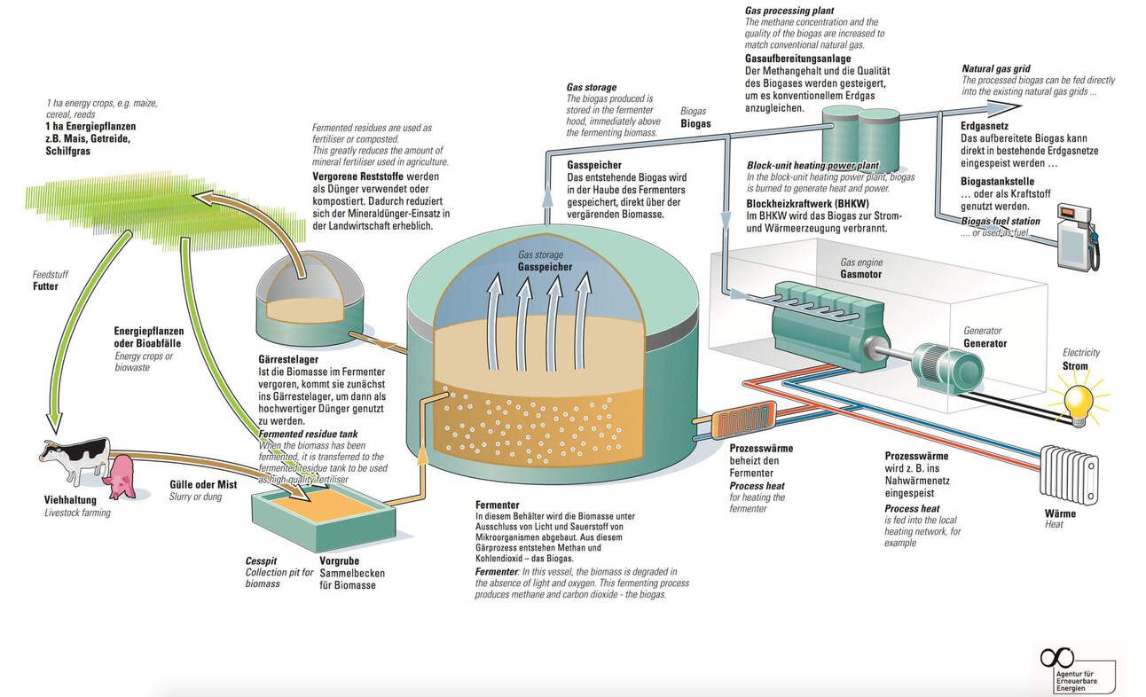 Esquema de geração de biogás de Feldheim: Vem das plantas e animais, se transforma em aquecimento, energia elétrica e fertilizante.