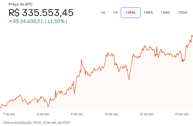 Em semana de forte alta, o BTC fechou com quase 12% de valorização. O resultado foi uma rima com a antepenúltima semana, anulando totalmente a queda do início do mês.